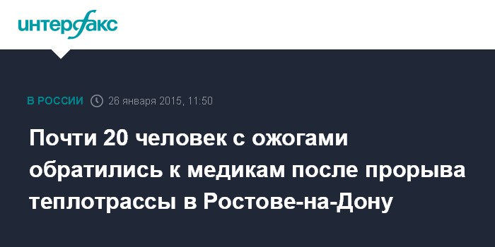 Москва. 26 января. INTERFAX.RU - Восемнадцать человек обратились с ожогами в медучреждения Ростова-на-Дону после субботней аварии на теплотрассе в центре города, девять из них госпитализированы, сообщает в понедельник пресс-служба мэрии.