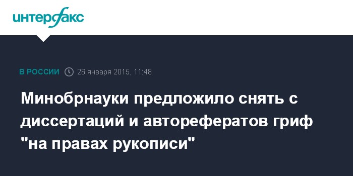 Москва. 26 января. INTERFAX.RU - В Минобрнауки РФ предожили правительству устранить правовую коллизию, связанную с текстами диссертаций и авторефератов - предлагается снять с них гриф "на правах рукописи" и сделать полноправной публикацией.