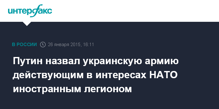 Москва. 26 января. INTERFAX.RU - Президент России Владимир Путин заявил, что украинская армия - это натовский легион, который преследует не национальные интересы Украины, а намерен достичь геополитических целей сдерживания России.