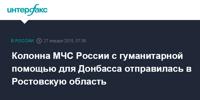 Москва. 27 января. INTERFAX.RU - Автоколонна МЧС России с гуманитарной помощью для Донецкой и Луганской областей около 6:00 вторника отправилась из Ногинского спасательного центра (Подмосковье) в Ростовскую область, сообщили в пресс-службе МЧС.