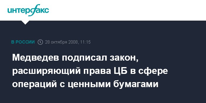 Москва. 28 октября. INTERFAX.RU - Президент РФ Дмитрий Медведев подписал закон о внесении изменений в закон о ЦБ РФ и в закон о рынке ценных бумаг, сообщила пресс-служба Кремля. Закон принят Государственной Думой 23 октября 2008 года и одобрен Советом Федерации 27 октября 2008 года.
