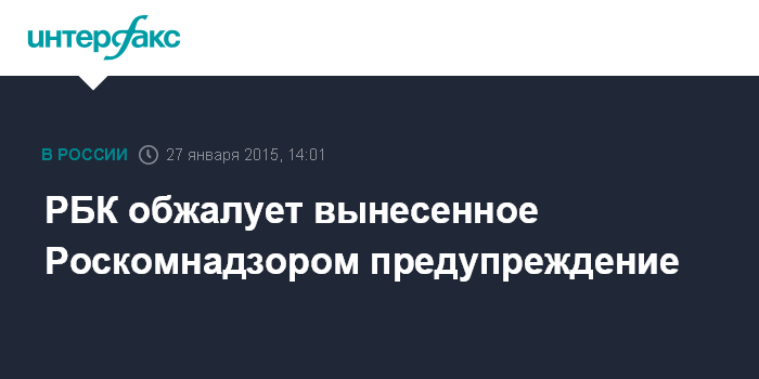 Москва. 27 января. INTERFAX.RU - Руководство РБК намерено обжаловать в суде предупреждение, которое Роскомнадзор вынес одноименной газете. Об этом "Интерфаксу" сообщили в пресс-службе издания во вторник.