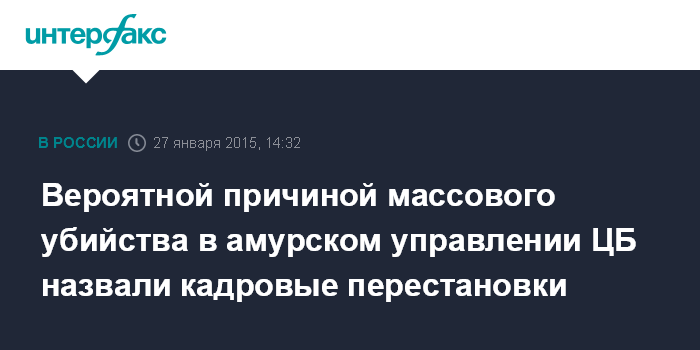 Москва. 27 января. INTERFAX.RU - Убийство трех сотрудников главного управления Центробанка по Амурской области, по предварительным данным, могло быть связано с кадровыми перестановками, о которых стрелявшему сообщили накануне, сообщил источник в правоохранительных органах.