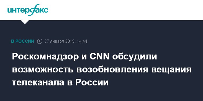 Москва. 27 января. INTERFAX.RU - Руководство Роскомнадзора и телеканала CNN на совместной встрече высказали взаимную заинтересованность в возобновлении вещания канала в России.