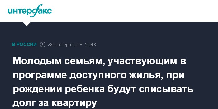 Москва. 28 октября. INTERFAX.RU - Столичным молодым семьям, которые приобретают квартиры по программе "Молодой семье - доступное жилье", при рождении ребенка будет списываться 30% ее стоимости, сообщил первый заместитель руководителя департамента жилищной политики и жилищного фонда Москвы Николай Федосеев журналистам во вторник.