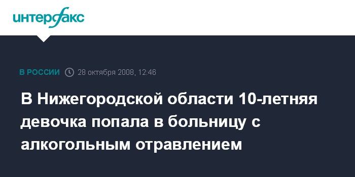 Москва. 28 октября. INTERFAX.RU - 10-летняя жительница Дзержинска (Нижегородская область) госпитализирована с диагнозом "алкогольное отравление".