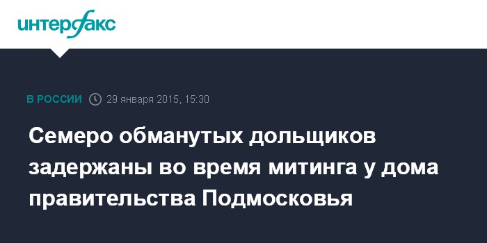 Москва. 29 января. INTERFAX.RU - Семь человек задержаны за проведение несанкционированного митинга напротив дома правительства Московской области, сообщил "Интерфаксу" координатор движения "Однодольщики" Игорь Гульев.