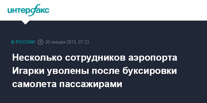 Москва. 30 января. INTERFAX.RU - Несколько работников аэропорта в Игарке, где в конце ноября 2014 года пассажиры вручную выталкивали самолет Ту-134 на взлетную полосу, уволены, сообщила "Интерфаксу" старший помощник Западно-Сибирского транспортного прокурора Оксана Горбунова.