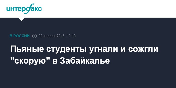 Москва. 30 января. INTERFAX.RU - В Приаргунском районе Забайкальского края полицейские задержали двух студентов местного техникума, которые угнали машину "скорой помощи" и сожгли ее, сообщает пресс-служба краевого УМВД.