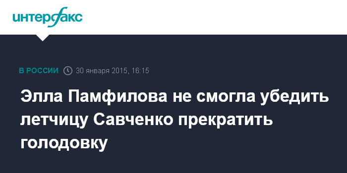 Москва. 30 января. INTERFAX.RU - Украинскую летчицу Надежду Савченко, арестованную в России за пособничество убийству российских журналистов, не удалось убедить прекратить голодовку, сообщила "Интерфаксу" в пятницу уполномоченный по правам человека в РФ Элла Памфилова.