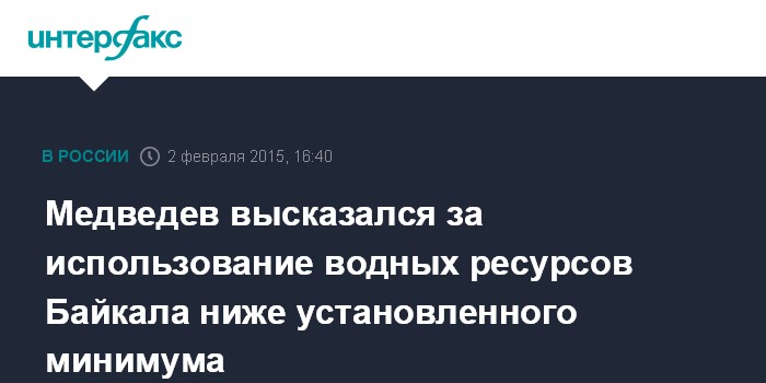 Москва. 2 февраля. INTERFAX.RU - Уровень воды в Байкале может упасть ниже критической отметки, необходимо разрешить использование водных ресурсов ниже установленного минимального уровня, заявил премьер-министр Дмитрий Медведев.
