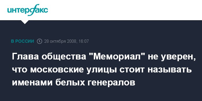 Москва. 28 октября. INTERFAX.RU - Глава российского правозащитного общества "Мемориал" Арсений Рогинский призвал с осторожностью подойти к общественной инициативе назвать московские улицы именами лидеров белогвардейского движения - адмирала Александра Колчака и генерала Владимира Каппеля.