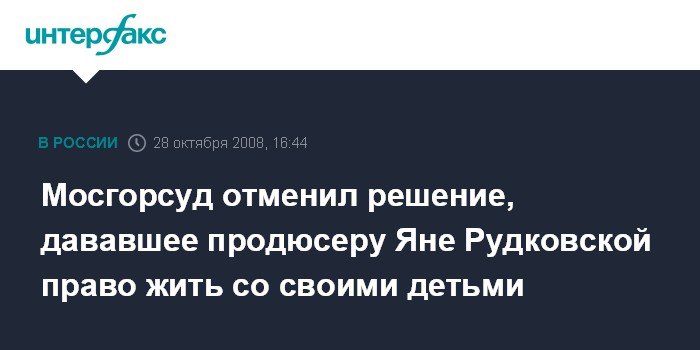 Москва. 28 октября. INTERFAX.RU - Мосгорсуд признал незаконным решение, по которому продюсеру Яне Рудковской было предоставлено право совместного проживания с детьми.