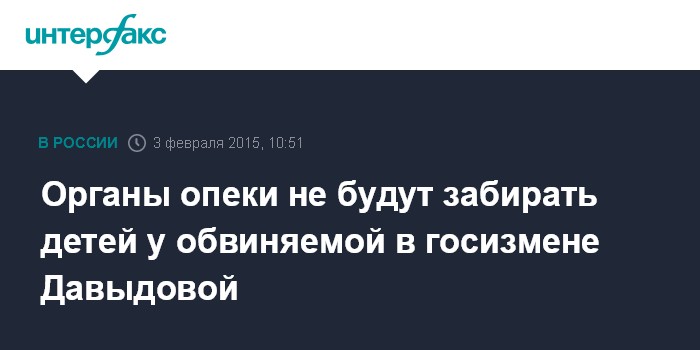 Москва. 3 февраля. INTERFAX.RU - Органы опеки не собираются забирать детей у жительницы Вязьмы (Смоленская область) Светланы Давыдовой, арестованной по обвинению в госизмене, сообщил уполномоченный по правам ребенка Павел Астахов.