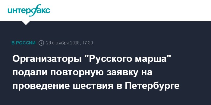 Москва. 28 октября. INTERFAX.RU - Организаторы "Русского марша" в Петербурге подали во вторник в Смольный повторную заявку на проведение шествия 4 ноября, сообщил "Интерфаксу" пресс-секретарь комитета по вопросам законности, правопорядка и безопасности Владимир Хохлев.