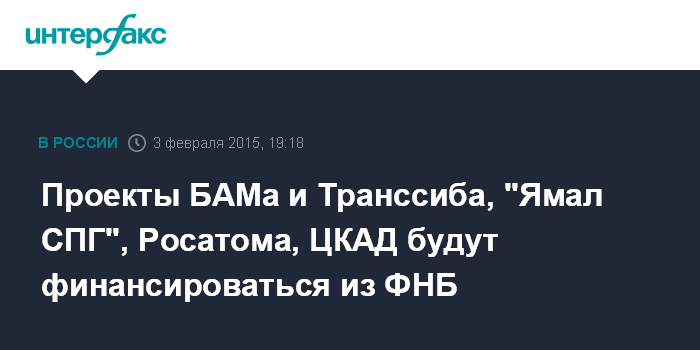 Москва. 3 февраля. INTERFAX.RU - Проекты БАМа и Транссиба, "Ямал СПГ", "Росатома", ЦКАД будут финансироваться из Фонда национального благосостояния (ФНБ), заявил министр экономического развития Алексей Улюкаев по итогам совещания у президента Владимира Путина.