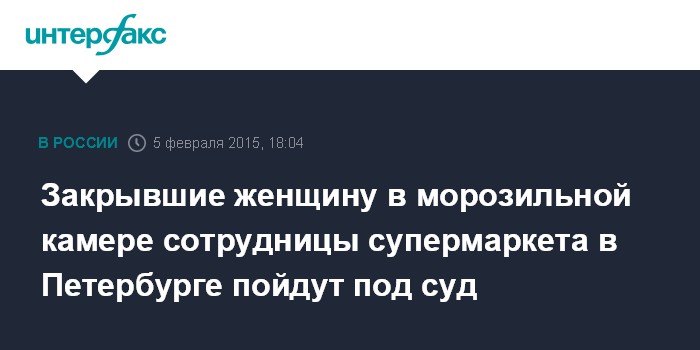 Москва. 5 февраля. INTERFAX.RU - Три сотрудницы сетевого супермаркета в Петербурге пойдут под суд за то, что силой поместили женщину, заподозренную в краже товаров, в морозильную камеру, после чего пострадавшая сама вызвала полицию, сообщили "Интерфаксу" в пресс-службе городской прокуратуры в четверг.