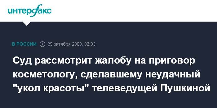 Суд рассмотрит жалобу на приговор косметологу, сделавшему неудачный "укол красоты" телеведущей Пушкиной