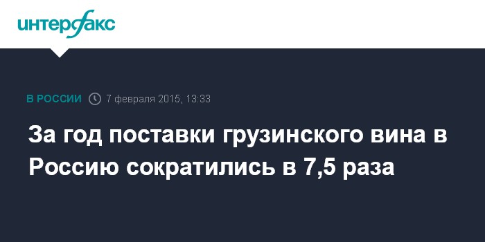 Москва. 7 февраля. INTERFAX.RU - Грузия в январе 2015 года экспортировала 1 млн 343 тысяч бутылок натурального виноградного вина (емкостью 0,75 литра), что в 3 раза меньше по сравнению с январем 2014 года, сообщили "Интерфаксу" в национальном агентстве вина Минсельхоза республики.