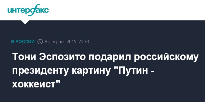 Москва. 8 февраля. INTERFAX.RU - Легенда мирового хоккея, канадско-американский хоккеист Тони Эспозито преподнес президенту России Владимиру Путину картину в подарок в день годовщины Олимпийских игр в Сочи.