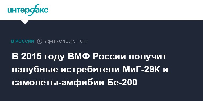 Москва. 9 февраля. INTERFAX.RU - Морская авиация ВМФ России в 2015 году получит на вооружение новые палубные истребители МиГ-29К, амфибии модернизированные противолодочные самолеты Ил-38 и Бе-12, а также вертолетов Ка-27ПЛ. Об этом сообщил журналистам в понедельник начальник Морской авиации ВМФ Герой России генерал-майор Игорь Кожин.