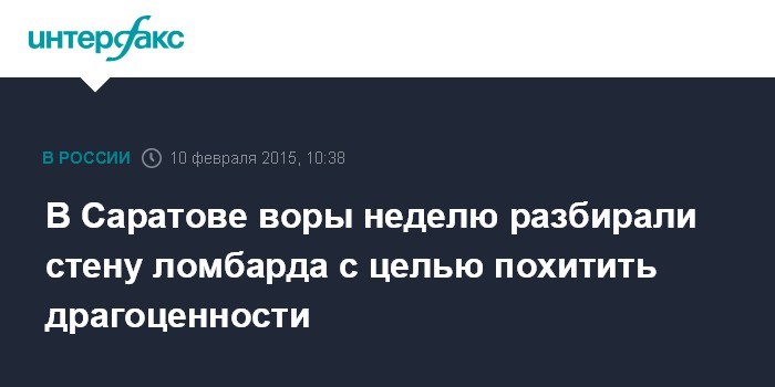 Москва. 10 февраля. INTERFAX.RU - В Саратове воры неделю разбирали стену ломбарда, чтобы похитить драгоценности на 1,8 млн рублей, сообщила пресс-служба ГУ МВД региона во вторник.