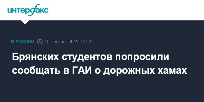 Москва. 10 февраля. INTERFAX.RU - Брянская Госавтоинспекция предложила студентам вузов и владельцам маршрутных такси стать добровольными помощниками ГИБДД в борьбе с хамством на дорогах.