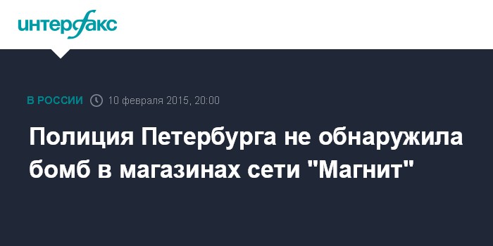 Москва. 10 февраля. INTERFAX.RU - Полиция Петербурга завершила проверку по факту сообщения о бомбах, якобы заложенных в универсамах сети "Магнит", сообщили "Интерфаксу" в пресс-службе ГУ МВД по Петербургу и Ленинградской области во вторник.