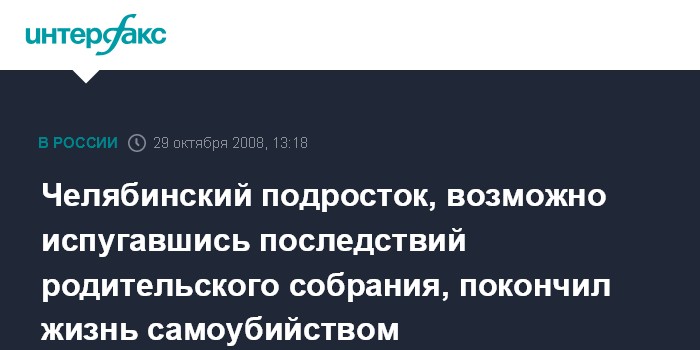 Москва. 29 октября. INTERFAX.RU - Следственной отдел города Миасса следственного управления СКП РФ по Челябинской области расследует обстоятельства самоубийства школьника, который повесился после родительского собрания.