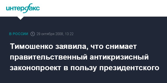 Москва. 29 октября. INTERFAX.RU - Премьер-министр Украины Юлия Тимошенко призвала Верховную Раду проголосовать за президентский законопроект, направленный на борьбу с последствиями мирового кризиса, согласившись снять с рассмотрения правительственный законопроект.