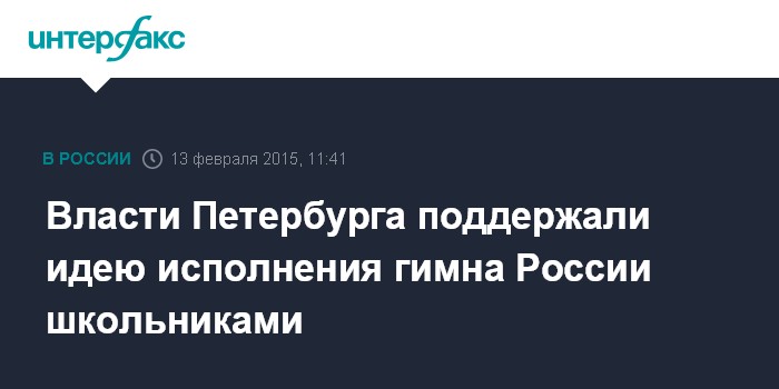 Москва. 13 февраля. INTERFAX.RU - Власти Петербурга поддерживают идею исполнения российского гимна школьниками в образовательных учреждениях.