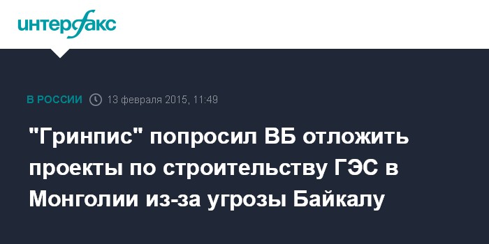Москва. 13 февраля. INTERFAX.RU - Экологи просят Всемирный банк отложить финансирование проектов по строительству гидроэлектростанций в Монголии из-за угрозы Байкалу.