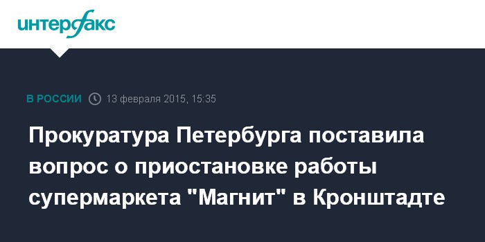 Москва. 13 февраля. INTERFAX.RU - Прокуратура инициировала вопрос о приостановлении деятельности магазина "Магнит" в Кронштадте, сообщает сайт Генпрокуратуры России в пятницу.