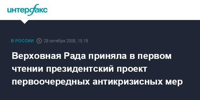 Москва. 29 октября. INTERFAX.RU - Верховная Рада приняла в первом чтении президентский проект закона "О первоочередных мерах по предотвращению негативных последствий финансового кризиса и о внесении изменений в некоторые законодательные акты Украины".