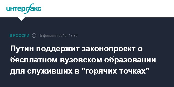 Москва. 15 февраля. INTERFAX.RU - Президент Росии Владимир Путин поддержал предложение включить участников боевых действий, в частности на Кавказе, в категорию лиц, имеющих право обучаться в вузах за бюджетный счет.
