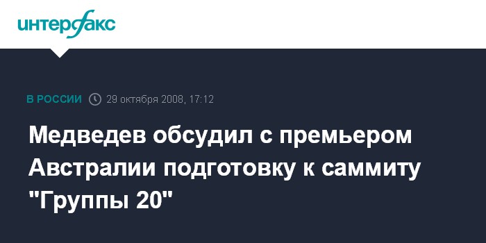 "Президент России отметил инициативную роль Австралии, направившей участникам предстоящей встречи свои предложения по преодолению последствий кризиса, - отмечается в сообщении. - В свою очередь, Радд позитивно оценил предложения, выдвигаемые Россией в этой области. Было условлено в период, оставшийся до вашингтонского саммита, продолжить экспертные консультации представителей правительств двух стран".