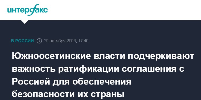 Москва. 29 октября. INTERFAX.RU - Руководство республики Южная Осетия давно ждало ратификации Договора о дружбе и сотрудничестве и взаимной помощи между республикой Южная Осетия и Российской Федерацией, заявил "Интерфаксу" вице-спикер парламента республики Южная Осетия Юрий Дзиццойты. По его словам, "это очень приятный факт, так как есть пункты, которые предполагают заключение отдельных соглашений между министерствами России и Южной Осетии".