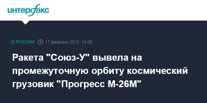 Москва. 17 февраля. INTERFAX.RU - Ракета "Союз-У", стартовавшая с космодрома Байконур во вторник, вывела на промежуточную орбиту грузовой космический корабль "Прогресс М-26М".