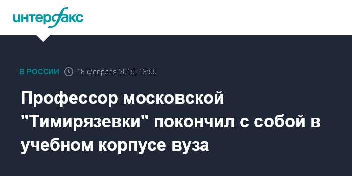 Москва. 18 февраля. INTERFAX.RU - Профессор сельхозакадемии имени Тимирязева покончил с собой в стенах ВУЗа во вторник, сообщил "Интерфаксу" источник в правоохранительных органах.
