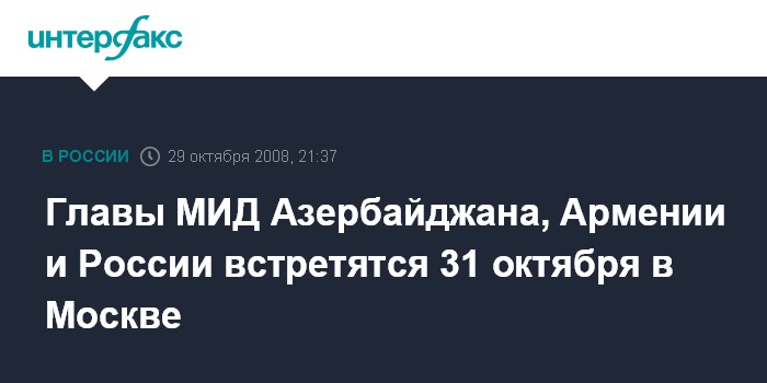 Москва. 29 октября. INTERFAX.RU - Главы МИД Азербайджана, Армении и России проведут 31 октября встречу в Москве, а 1 ноября пройдет встреча министров с сопредседателями Минской группы ОБСЕ, заявил журналистам исполняющий обязанности главы МИД Азербайджана Эльмар Мамедъяров.