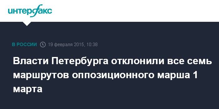 Москва. 19 февраля. INTERFAX.RU - Власти Петербурга не согласовали ни один из предложенных маршрутов оппозиционной акции 1 марта, сообщил депутат Законодательного собрания Борис Вишневский ("Яблоко").