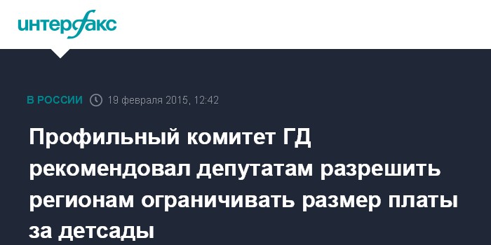 Москва. 19 февраля. INTERFAX.RU - Комитет Госдумы по образованию в четверг рекомендовал нижней палате одобрить в первом чтении проект закона, обязывающего регионы устанавливать размер максимальной платы для родителей за пребывание ребенка в детском саду.