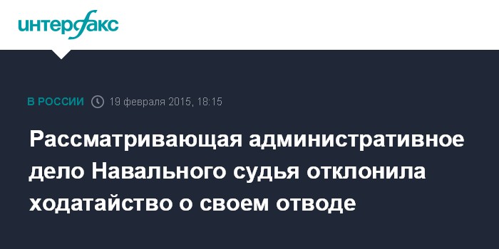 Москва. 19 февраля. INTERFAX.RU - Судья Пресненского суда Ирина Зубова, которая рассматривает административное дело в отношении оппозиционера Алексея Навального, отказалась взять самоотвод.