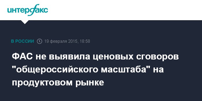 Москва. 19 февраля. INTERFAX.RU - Федеральная антимонопольная служба (ФАС России) не выявила сговоров "общероссийского масштаба" на продовольственном рынке за прошлый год, сообщил начальник управления по борьбе с картелями ФАС Андрей Тенишев на пресс-конференции в четверг в Москве.