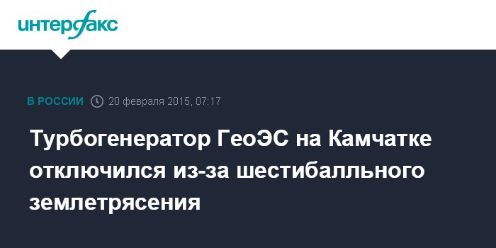 Москва. 20 февраля. INTERFAX.RU - Турбогенератор №2 Мутновской ГеоЭС-1 на Камчатке отключился из-за мощного землетрясения в ночь на пятницу, сообщили в компании "Геотерм".