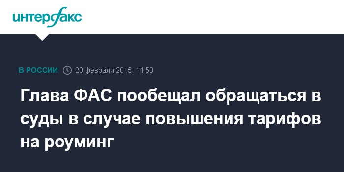 Москва. 20 февраля. INTERFAX.RU - Федеральная антимонопольная служба (ФАС) РФ намерена обращаться в суды в случае повышения операторами тарифов на роуминг, заявил руководитель ведомства Игорь Артемьев журналистам по окончании "правительственного часа" в Госдуме в пятницу.