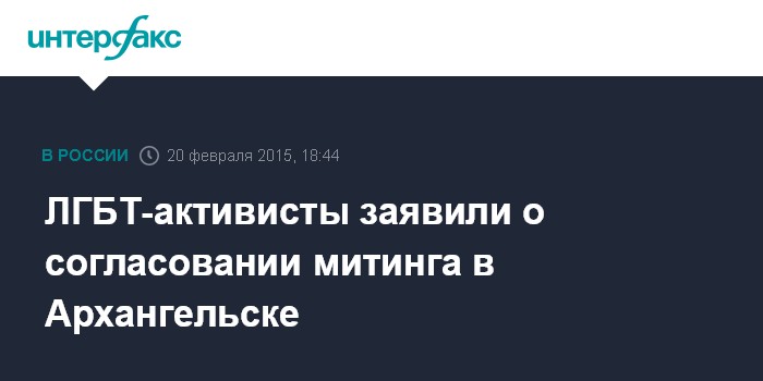 Москва. 20 февраля. INTERFAX.RU - Администрация Архангельска впервые согласовала проведение в городе митинга, организованного ЛГБТ-активистами, сообщает в пятницу интернет-ресурс GayRussia.Ru.