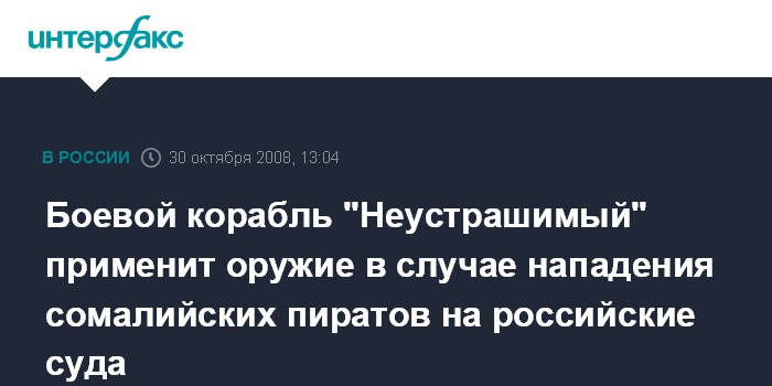 "В случае попыток пиратских нападений на российские суда экипаж "Неустрашимого" готов предпринять, в том числе, и силовые меры, в рамках соответствующих документов ООН", - заявил И.Дыгало
