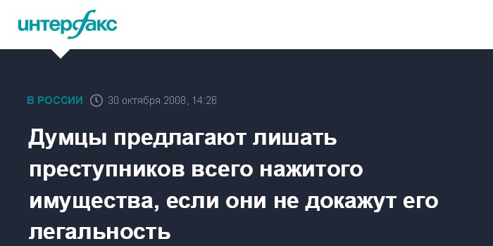 Москва. 30 октября. INTERFAX.RU - В комитете Госдумы по безопасности звучат предложения отменить презумпцию невиновности и, в целях эффективного "последовательного и полного изъятия дохода от криминальной деятельности", обязать преступников самих доказывать легальное происхождение их имущества.