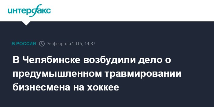 Москва. 25 февраля. INTERFAX.RU - В Челябинске возбуждено уголовное дело по факту причинения травм местному предпринимателю во время любительского хоккейного матча, сообщил в среду прокурор Челябинской области Александр Войтович.